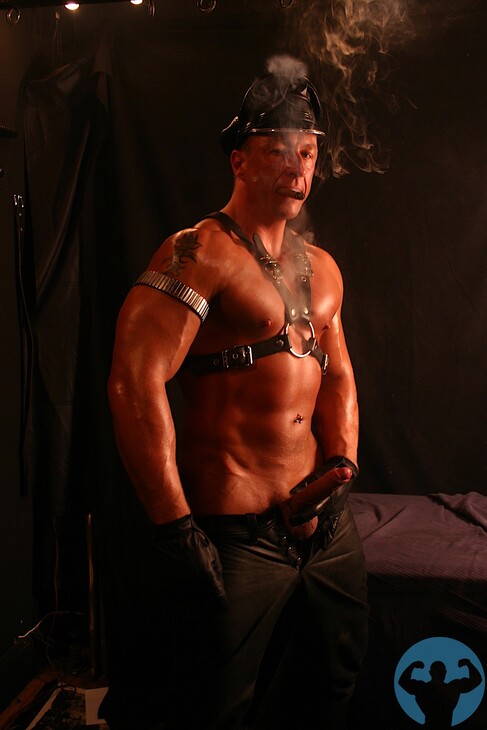 Big dicked leather Musclehunk Aaron Giant smoking